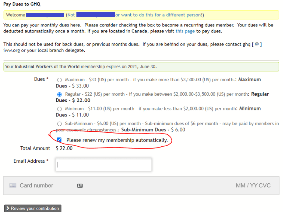 6. Select the appropriate dues rate and be sure to check “Please renew my membership automatically” so you don’t have to manually pay every month. Enter credit/debit card information and click “Review your contribution” at the bottom to finish the transaction.